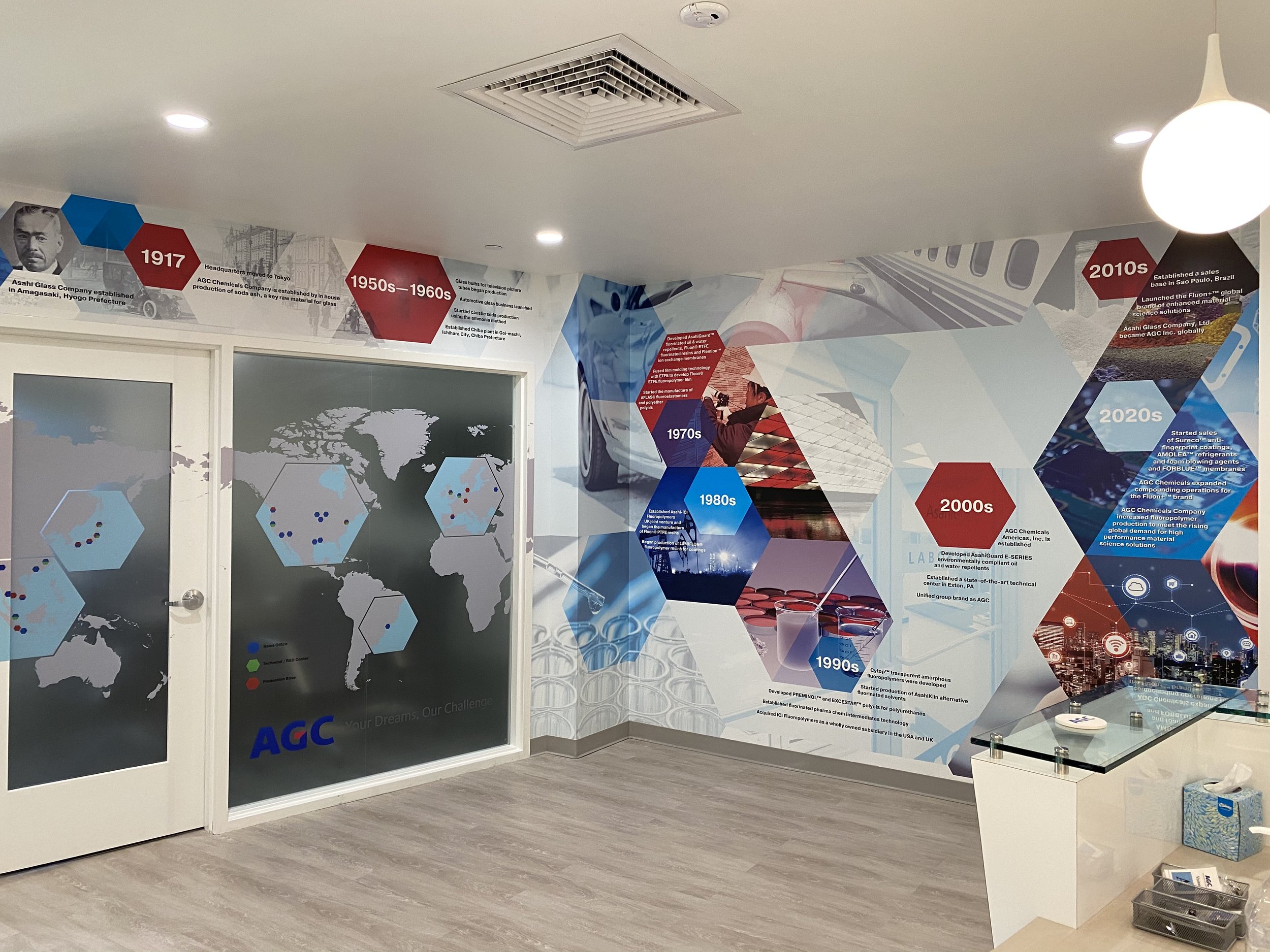 Transforming corporate office settings by utilizing frosted glass window films, timeline walls and graphics